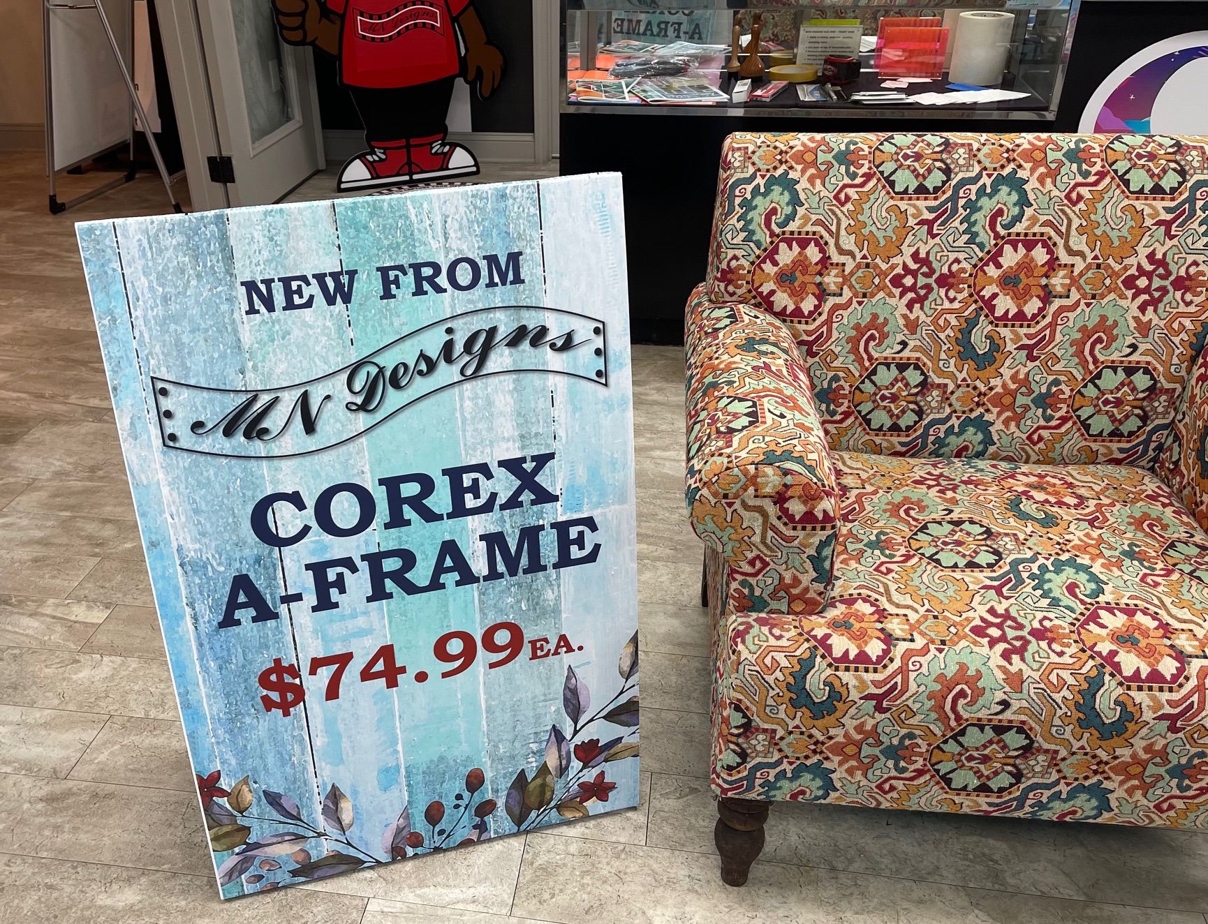 22″x36″ double-sided A-frame made of Corrugated Plastic. Full color graphics allow custom prints on both sides.