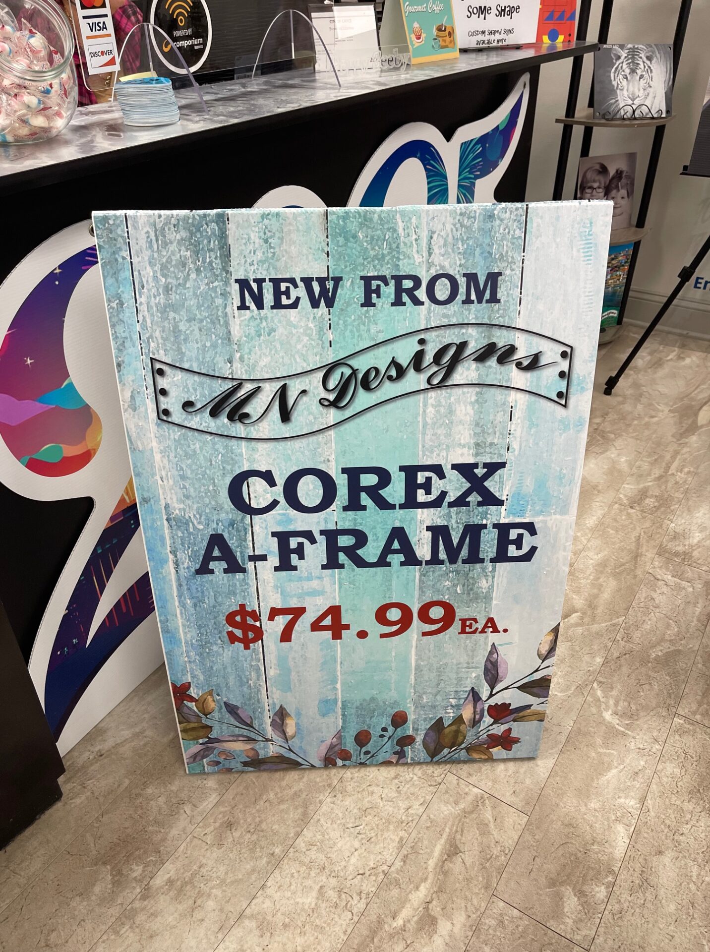 This A-Frame, aka sandwich board, is made of lightweight corrugated plastic.